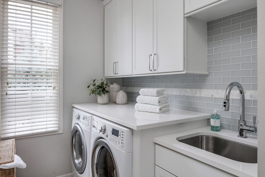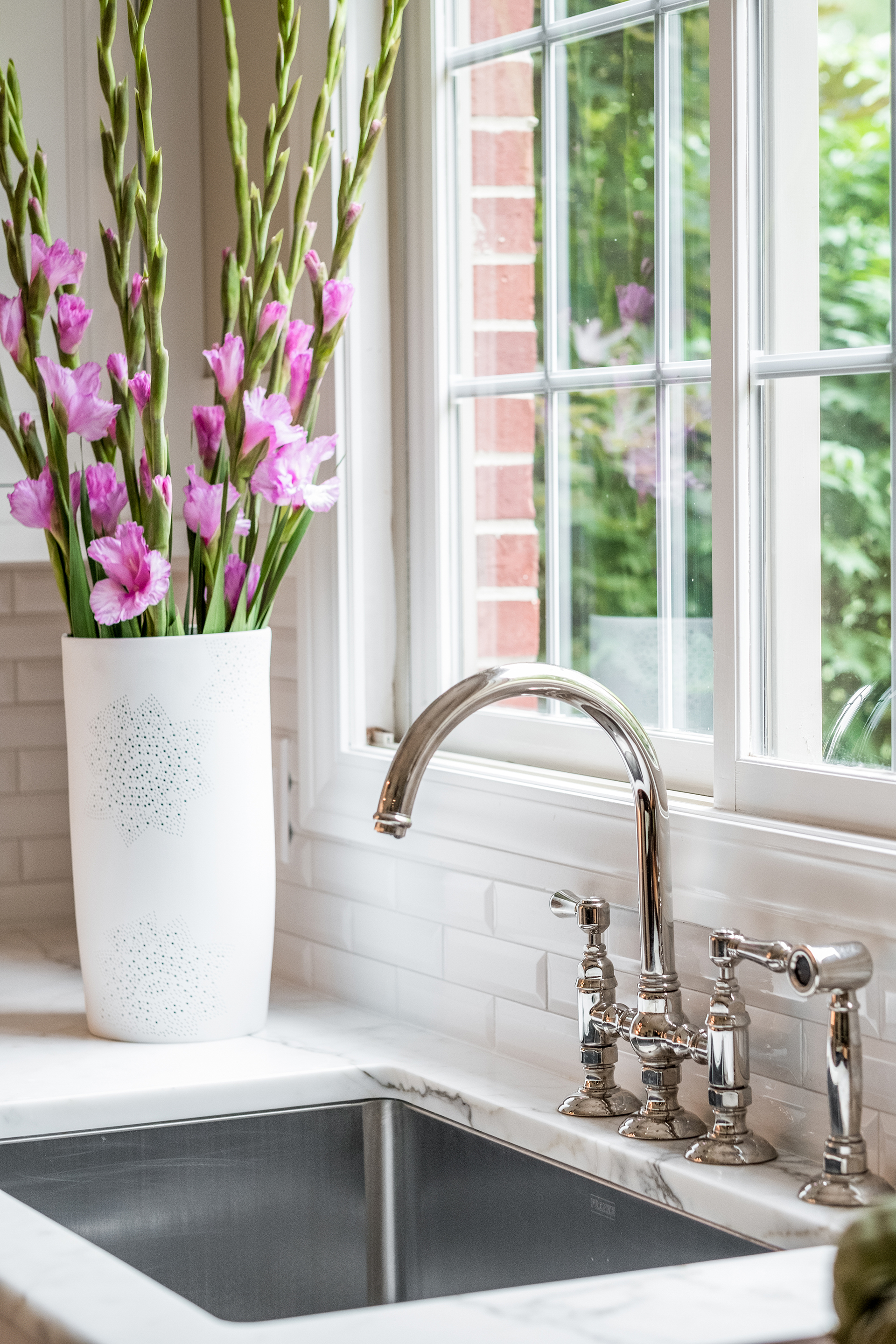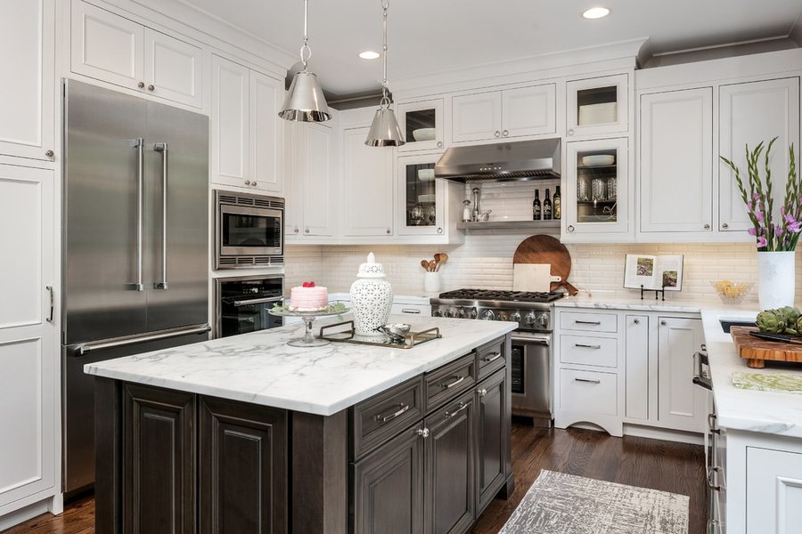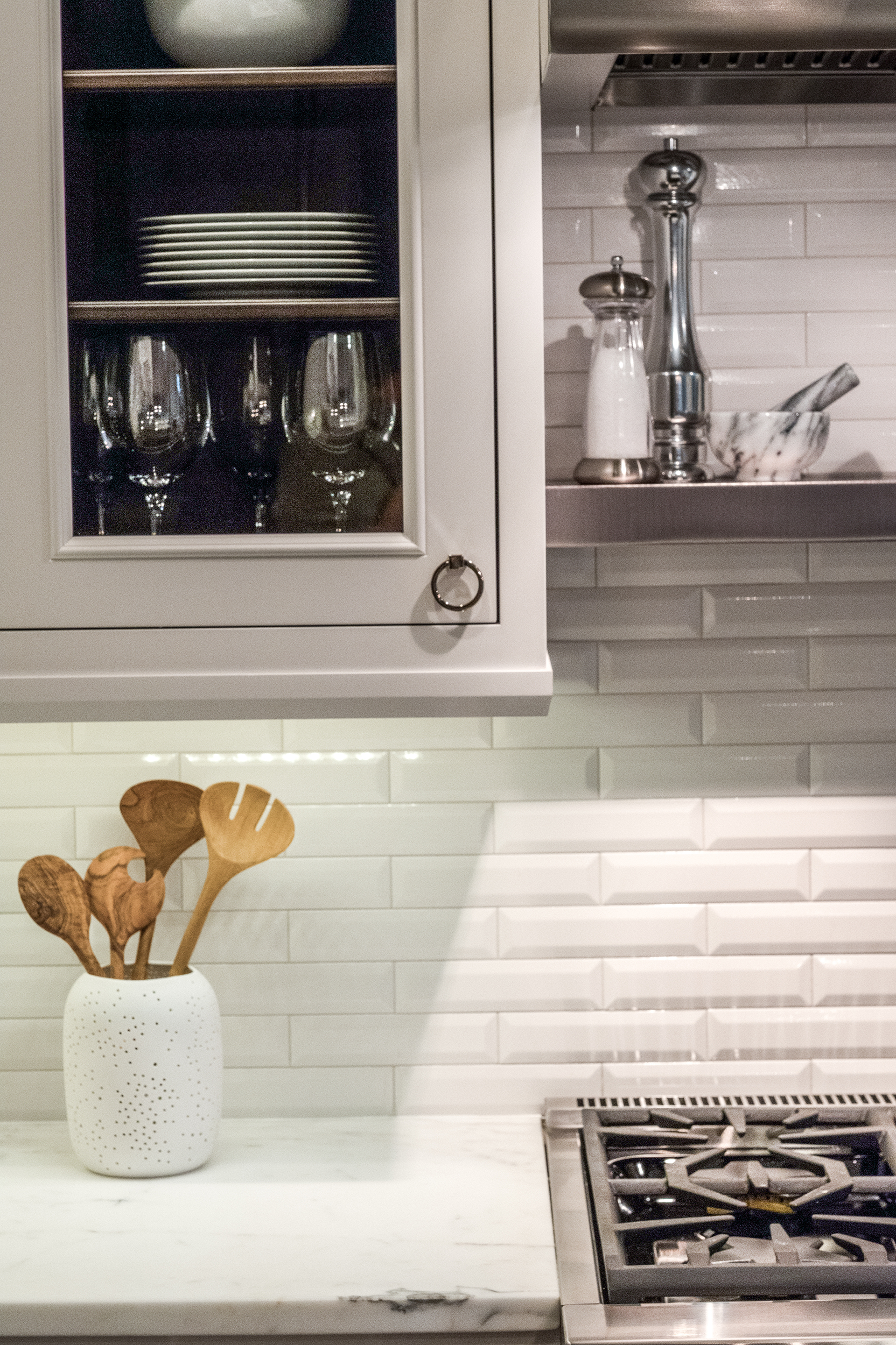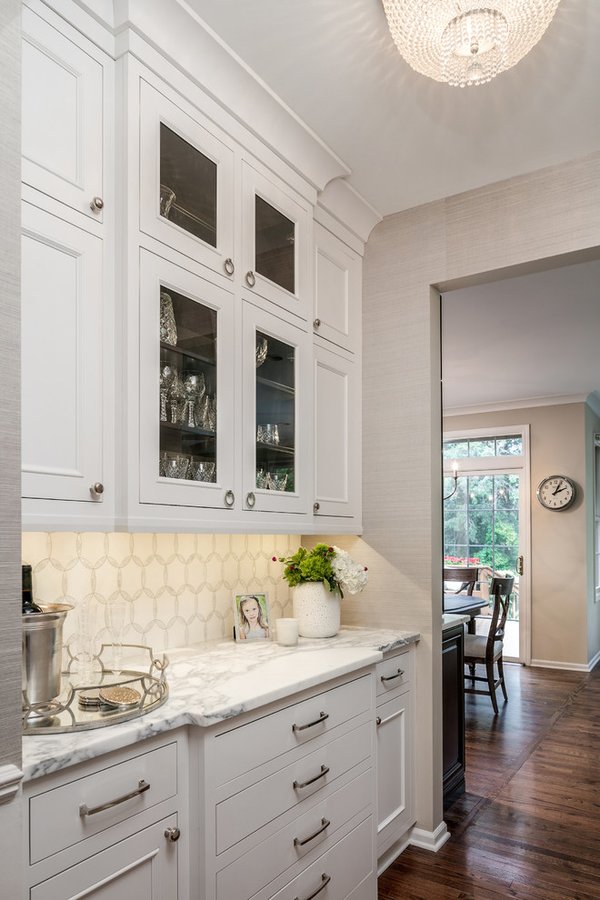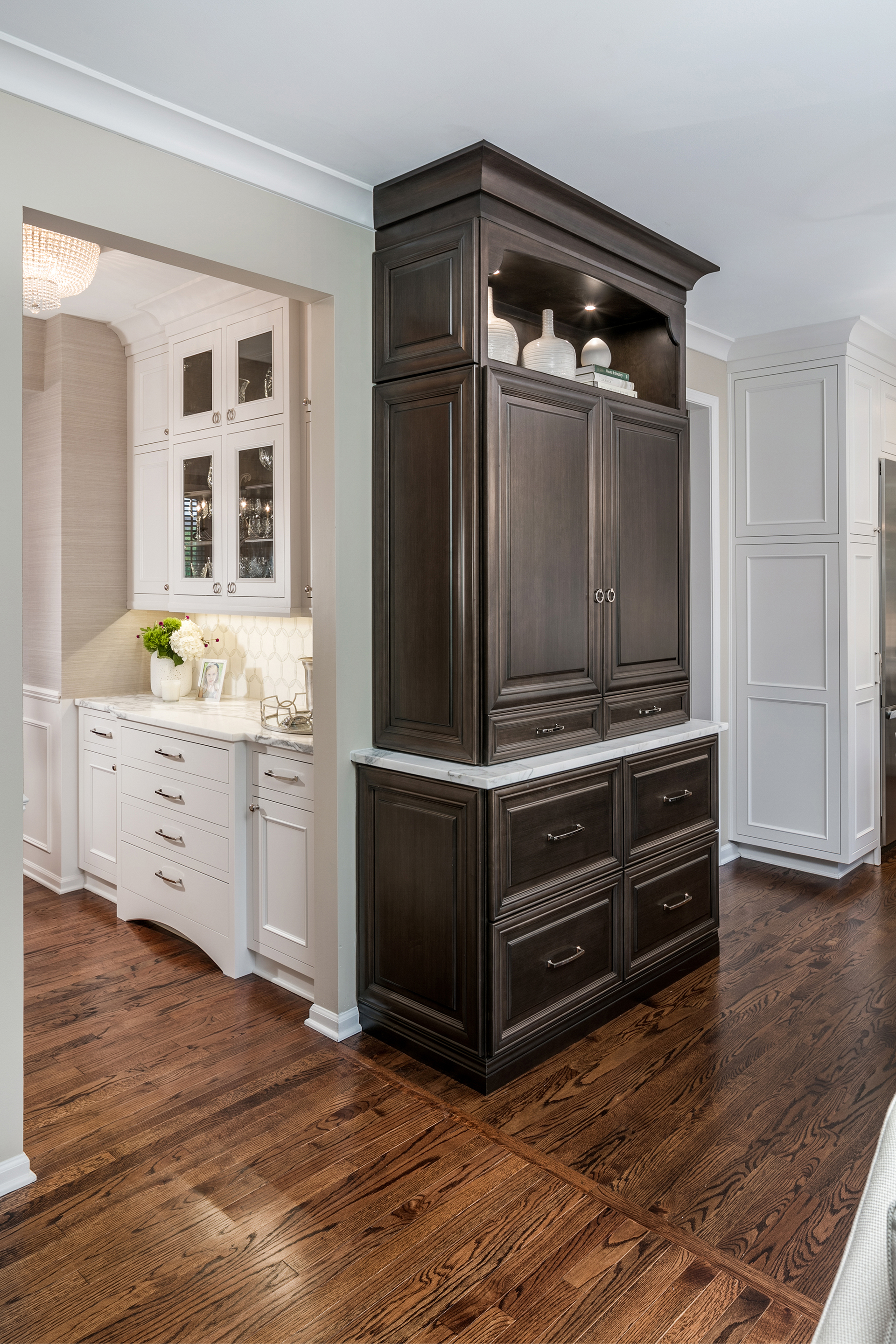 Amberly Lane was a full kitchen, butler’s pantry & laundry room renovation, Homeowners were ready to update there builder grade kitchen with something more personal. Removing old tile and adding new hardwood floors into the kitchen to tie into the existing family room made the space feel larger and unified. We reworked the floor plan in the kitchen to house appliances, increase function and enlarge the island. Removing an old desk from the eating space and replacing with a custom hutch that hides away the clutter of daily life but also keeps things on hand when needed. Butler’s panty was given a fresh look with grass cloth and mosaic tile along with glass cabinet with contrasting interior to display serving pieces. New tile in the mud hall and laundry allows for a durable surface when entering from the Garage. New appliances, cabinetry, glass and marble backsplash and a elegant white countertop provides the homeowner a clean and bright space.